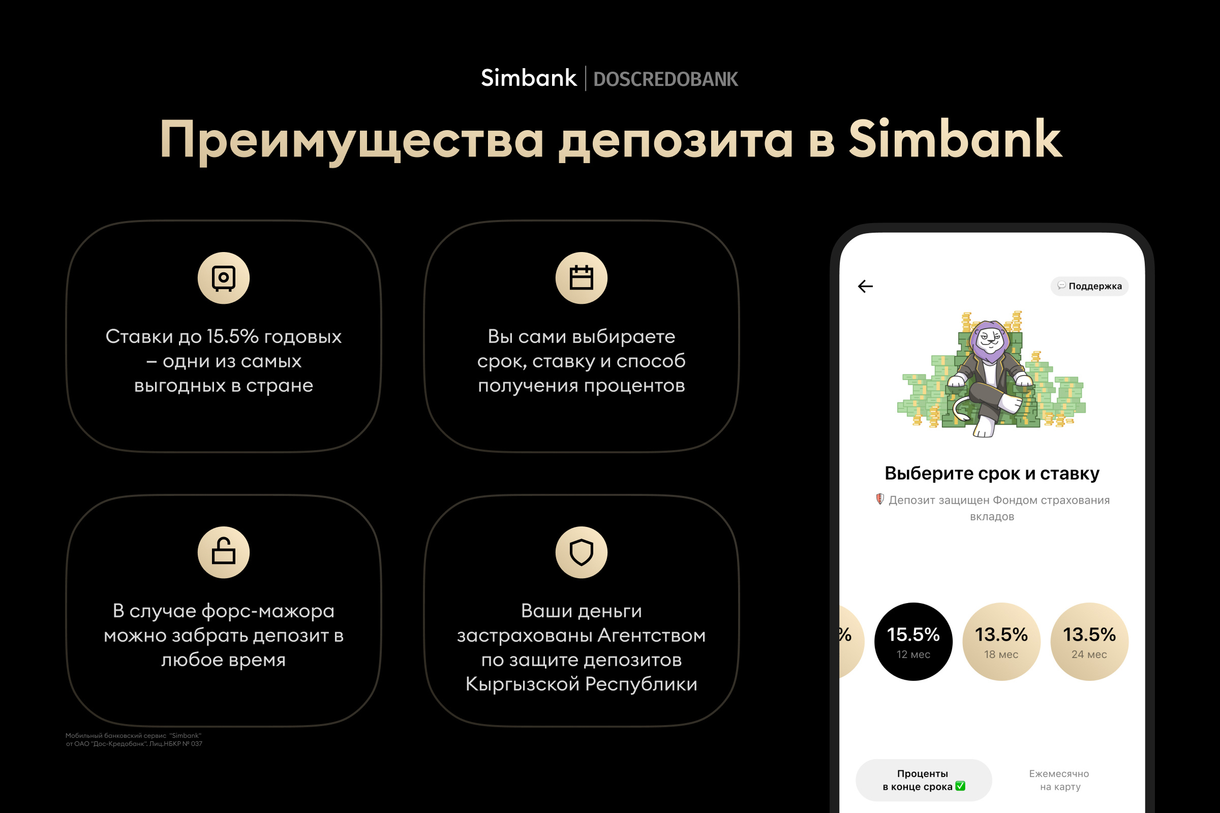 - Высокая доходность. Ставки до 15,5% годовых - одно из самых привлекательных предложений на рынке Кыргызстана.