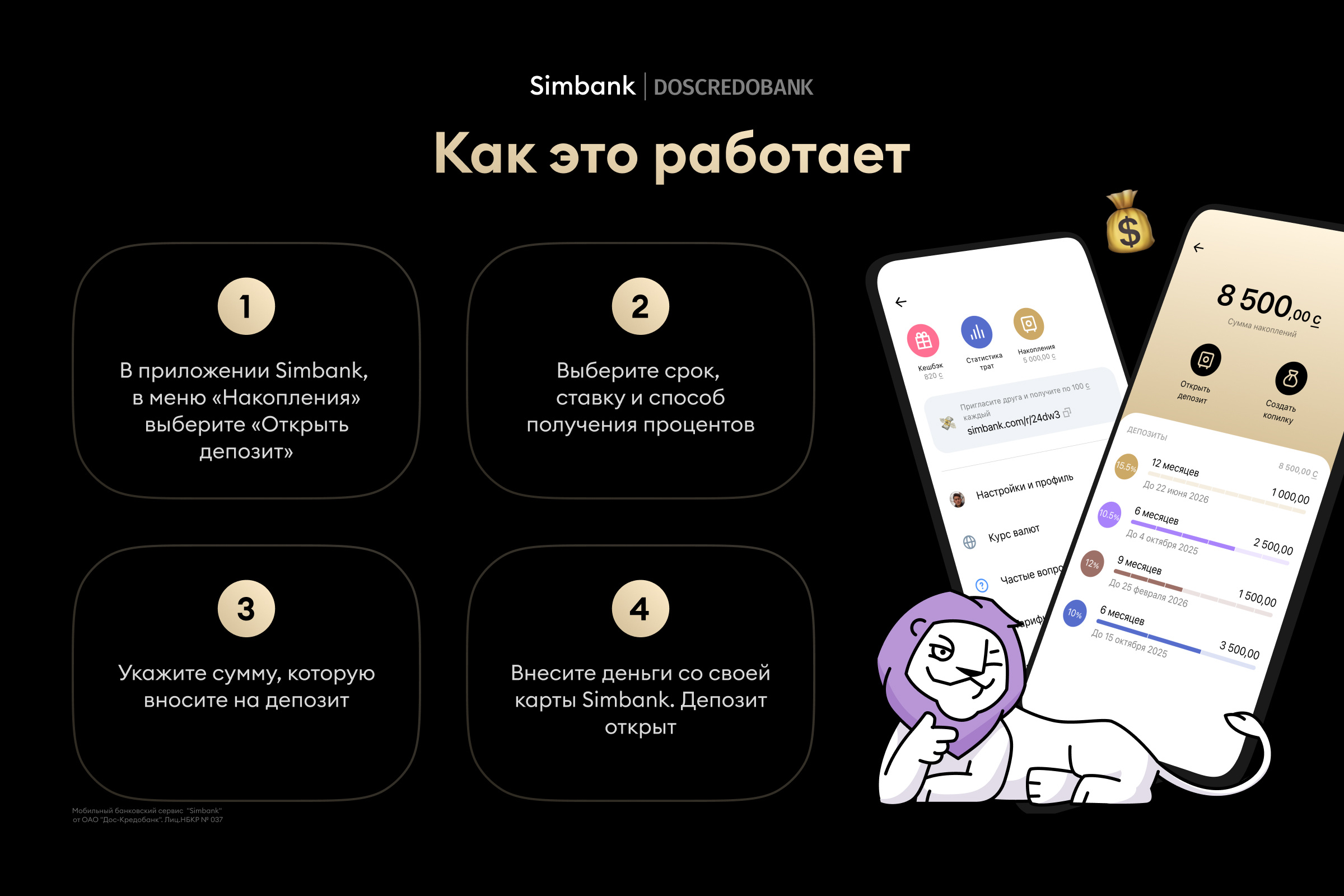 "Мы хотим, чтобы банковские продукты были не только выгодными, но и максимально понятными. Депозит в Simbank - это возможность получать доход без лишних сложностей, а управление всегда под рукой в приложении", - отмечают в Simbank.