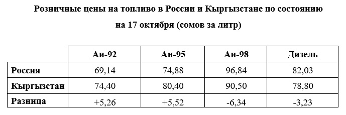 Стоимость ГСМ в Кыргызстане зависит от ситуации на мировом рынке, прежде всего в России, откуда мы импортируем основной объем нефтепродуктов – 95%. Как видно из представленных таблиц, цены в РФ уже сопоставимы с КР или даже выше.