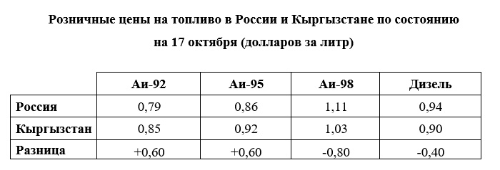 Цены на топливо в Кыргызстане и России почти сравнялись