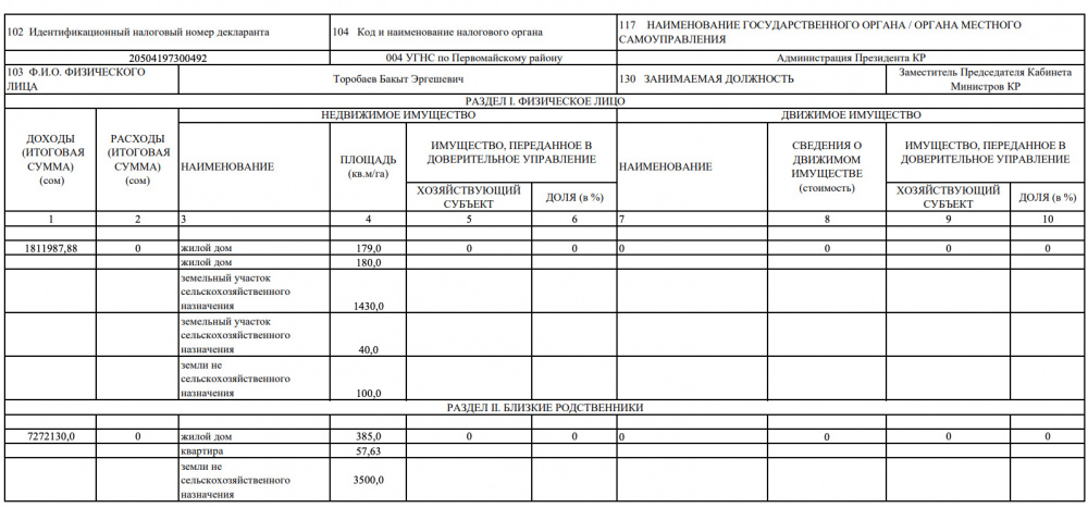 Замглавы кабмина и министр сельского хозяйства в одном лице Торобаев отчитался о доходах в 1 млн 811 тыс. 987,88 сома. Расходы он не указал. У Торобаева есть два дома (179 и 180 кв. м) и три земельных участка с разным назначением площадью в 0,7 га.