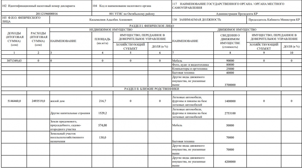 Касымалиев сообщил, что в 2024 году заработал 3 млн 71 тыс. 349,63 сома. Его средняя зарплата составила 256 тыс. сомов. В собственности есть мебель, бытовая и другая техника, а также движимое имущество на сумму 3,935 млн сомов. Земельных участков у Касымалиева не имеется. Зато у ближайших родственников и доходы выше, и расходы указаны.