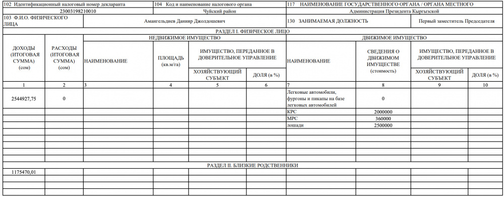 Амангельдиев сообщил, что заработал 2 млн 544 тыс. 927,75 сома. Расходы не указал. У Амангельдиева нет авто, но есть крупный и мелкий рогатый скот на сумму в 4,86 млн сомов. Родственники отчитались о доходе в 1 млн 175 тыс. 470 сомов.